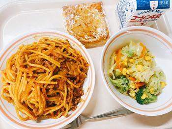 スパゲッティボロネーゼ バジルサラダ 手作りアップルデニッシュ 牛乳