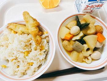 コーン茶飯 おでん ワカサギフリッター オレンジ 牛乳