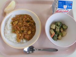 キーマカレーのキーマとは、細かいものという意味です。いつものカレーライスはルウを作っていますが、今日はひき肉、玉ねぎ、にんじんを炒めた後、小麦粉をふり入れて硬さを出しています。小さく切ったピーマンやきれいな緑色のグリンピース、黄色い粒のチーズ、かわいいひよこ豆、溶けてうま味になったトマトが合わさりおいしいキーマカレーが出来ました。いつものカレーライスも人気ですが、特に低学年の子達から「全部食べたよ!はじめて減らさなかったよ!」など、嬉しい感想を聞くことができました。 |