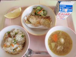 11月4日(火) コーンピラフ 鱈のパン粉焼き ざっくりサラダ アルファベットスープ グレープフルーツ、牛乳 |