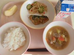 12月1日(月) ご飯 鯖の葱味噌焼き 春雨サラダ 豚汁 りんご 牛乳