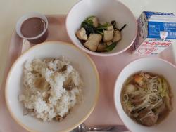 もみじ音楽集会に合わせて、秋らしい献立にしました。北海道産の鮭を焼いてからほぐし、味をつけて煮た舞茸と一緒にご飯に混ぜました。舞茸の香りとうまみが引き立つご飯です。午前の児童発表会で思い切り歌い、演奏した子どもたちもよく食べていました。旨煮は白菜のあまみが肉団子とよく合います。ココアプリンは嬉しいデザート。給食見本の前で、やった!と声が聞こえてきました。 |