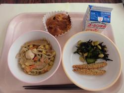 給食のラーメンはいつも人気があります。薄味ですがうま味があり、麺がよく味を含んでいます。子どもたちから、家や外食で食べるラーメンとは違うけどおいしいとの感想がありました。麺の補食として出しているアップルケーキは、スライスした旬のりんご、りんごジュース、すりおろしにんじん、レーズンなどを入れました。そのままでもおいしいですが、色々な料理やお菓子にアレンジできるくだものです。 |