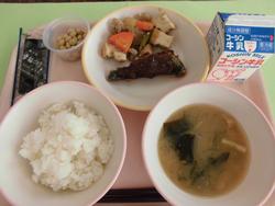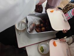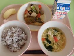 彩りの良い和食の日です。煮物に使った大根、人参は千葉県産、かぶは松戸市産です。かぶは煮物の具の中でも最後に入れましたが、あっという間にやわらかくなるあまいかぶでした。黒鯛は船橋港でとれた魚です。身はしっかりして味がよいです。骨がかたいので食べる時は注意が必要です。かきたま汁の小松菜は松戸市産、葉に厚みがあり、太い茎には特に甘みがありました。今日もよく食べていました。 |