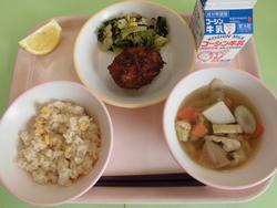 2月5日(木) コーン茶飯 松戸産ねぎのさつま揚げ 青菜のソテー のっぺい汁 はるか 牛乳