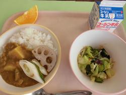 冬野菜のカレーライスの特徴は2つ。①じゃが芋の代わりに里芋を入れました。②長葱と蓮根をトッピングにしました。里芋はぬるっとしているので、口の中でざらつきがなくカレールウとよく馴染みます。長葱は松戸市でとれた矢切ねぎで、蓮根は千葉県旭市でとれました。今日はオーブンで焼いで少し焦げ目をつけました。香ばしく野菜本来のあまみが楽しめるように調理しました。給食の時間に、長葱を食べた瞬間「あまい!」との感想や、「はじめてれんこんを食べてみたよ。」との声がありました。旬の食材を味わって食べています。 |
