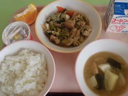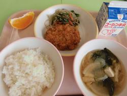 カリカリがんもが大人気でした。大人気だったのでレシピを紹介します。1人分材料:豆腐55g、乾燥芽ひじき0.2g、ツナ6g、卵4.5g、とろろいも1g、枝豆2.5g、おろし生姜1g、醤油1g、塩0.1g、片栗粉1g、コーンフレーク8g 作り方:①豆腐の水分を予めきっておく。ひじきは水で戻す。 ②コーンフレーク以外の材料を混ぜ合わせる。 ③形を作りコーンフレークをまぶす。 ④油で揚げる(170℃位)。※揚げる直前にコーンフレークをつけます。校長「周りはカリカリで中はふわふわ。最高でした。そして、今日はこんにゃく入りの胡麻和え。初めて食べましたが、大好きになりました。」 |