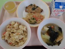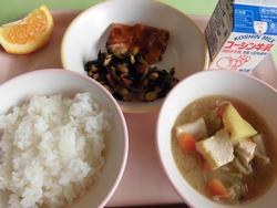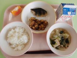 昨日の納豆に続き、今日は茹でた大豆をご飯に入れました。給食の時間に、「昨日の納豆と同じだね。」と気が付く子がいました。大豆の仲間を関連付けて食べることができています!魚は鯵をしょうゆベースのタレに長葱や青しそを一緒に漬け込んで焼きました。身の中央に血合い骨があったので、魚の骨が怖いと思っている子に取り方を説明しました。鯵は比較的骨を見つけやすい魚で、上手に食べると骨を取り除くのも楽しくなってきます。うま味が強いので食べたい気持ちが骨を探すことに一躍買っていました。 |
