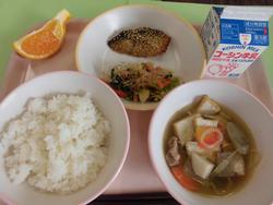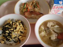 2月27日(金) ご飯 卵ふりかけ 赤魚の照焼 切干大根と青大豆のサラダ ごま仕立ての豚汁 牛乳 |