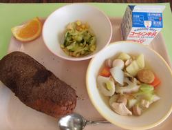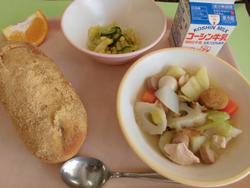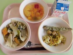 デザートのフルーツポンチは給食委員会が集計した「栗小給食ランキング、デザート部門第2位」の人気メニューです。2種類のゼリー(サイダー味とぶどう味)がきれいです。ほうとうは山梨県の郷土料理。うどんの麺は太く、おいしい出汁を吸って、食べすすめるうちにどんどんおいしくなります。ほうとう、ソテー、フルーツポンチは給食室の回転釜で作りました。栗っ子達は「同じ釜で作ったご飯を食べた仲間」。たくさんの時間を一緒に過ごし、様々な体験や思いの共有に給食も一役買っています。 |