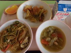 2月20日(金) チャプチェ丼 手作りポテトチップ 野菜とお豆のコンソメスープ オレンジ 牛乳 |