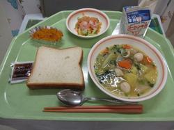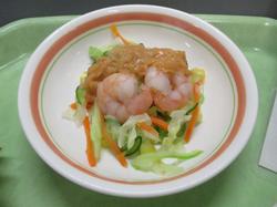 本日の給食です。リクエストメニューは「小エビのカクテルサラダ」です。千葉県で創業され、今や本州のすべての都府県に出店しているという某ファミリーレストランで人気のサラダのおいしさを、給食で再現してほしいというたくさんの生徒の声に応えて開発された新メニューです。プリッとした食感のエビや野菜の上に甘酸っぱいオーロラソースがかかっており、本格的な味わいでした。栗中の給食は、チャレンジ精神を大切に、日々進化しています。