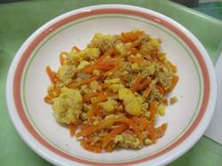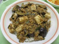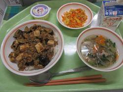 本日の給食です。10月10日は、10を横に2つ並べると眉と目に見えることから「目の愛護デー」に制定されているということにちなんで、目の健康をサポートする栄養素である、ビタミンA(にんじん・卵など)や、アントシアニン(なす・ブルーベリーなど)を取り入れた献立が提供されました。「麻婆なす丼」は濃い目の味付けのこってりした麻婆餡になすの甘みが相性抜群で、目に優しいだけでなく、食べ応えがあってとても美味しいメニューでした。