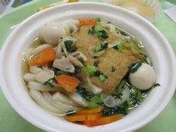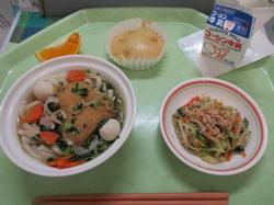 本日の給食です。「きつねもちうどん」は、甘辛く味付けされた油揚げの中に大ぶりの餅が入っており、だしのきいた優しい味わいのスープの中で存在感が際立つ、ボリューム満点の一品でした。なお、「油揚げ」が「きつね」と呼ばれる理由には、昔話等の中で「きつねは油揚げが好き」というイメージが広がったというものや、油揚げに酢飯を詰めた「稲荷寿司」が「稲荷神に供える食べ物」として広がり、稲荷神の使いがきつねであることから、油揚げ=きつねというイメージが定着したというものなど、いくつかの説があるそうです。