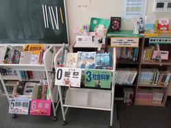 本日から「新刊フェア」を行っているということで、図書室をご紹介します。栗ケ沢中学校の図書室は、蔵書数約1万2千冊、専門書から漫画まで、多様な書物が取り揃えられています。夏季休業中には大幅な模様替えを行い、ますます利用しやすい配置となりました。現在は「新刊フェア」ということで、図書委員を中心として、書店顔負けのレイアウトが施されていました。これを機会に、本に親しむ生徒が一人でも多くなっていってほしいなと思います。