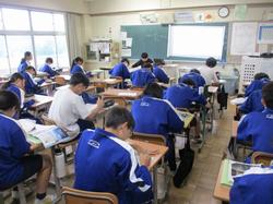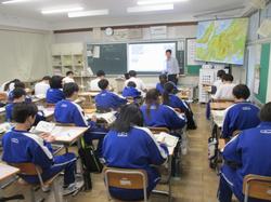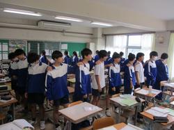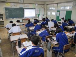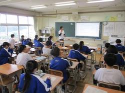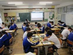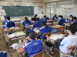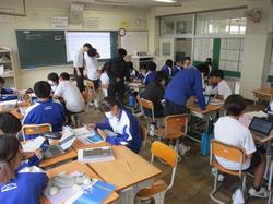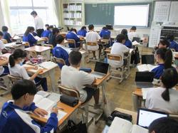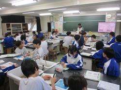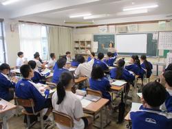 本日の授業の様子です。2年生の理科の授業では、ヒトの神経系についての学習をしていました。クラスで1つの列をつくり、隣の人から肩を叩かれたら次の人の肩を叩いて刺激をつないでいく実験を行い、ヒトの体内で刺激を受けてから筋肉を動かすまでにどのくらい時間がかかるかを測定していました。触覚繁樹によるヒトの単純反応(刺激に対して決まっている動作を行う)時間の平均は、0.15~0.2秒で、同じ反応を繰り返すことで、より早く反応できるようになっていくそうです。より良い記録を目指し、楽しそうに実験に取り組んでいました。