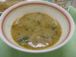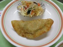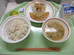 本日の給食です。「手作り揚げ餃子」は、とても大きな餃子の皮に胡椒の効いたジューシーな餡を詰め、カリカリ食感になるまで揚げられたもので、ごはんに良く合い、とても美味しかったです。「ピリ辛坦々スープ」は、コクのあるピリ辛のスープで、もやしなどの具材も入っていて、食べ応えがありました。このスープに麺を入れて担々麺として食べたいなと思うくらい、完成度の高い坦々スープでした。