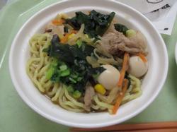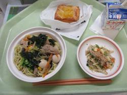 本日の給食です。「出汁香る醤油ラーメン」は、もやしやきくらげ、コーン、ウズラの卵など具材の種類が多く、それぞれの味わいが出汁のしっかり効いた上品なつゆに混然一体となっており、上品なおいしさのラーメンでした。「焼きたてりんごのデニッシュ」は、サクサク食感の生地を一口噛むと、バターの香りが口いっぱいに広がり、リンゴの甘さとほのかな酸味が心地よく、まさに絶品の美味しさでした。専門店でもなかなか味わうことができない、非常に完成度の高いスイーツでした。