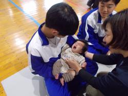 今週の月曜日から本日まで延べ4日間、おやこde広場小金原さんにご協力いただき、3年生を対象に赤ちゃんふれあい体験を行いました。まずは教室で赤ちゃんについて学んだ後、赤ちゃんたちが待つ部屋へと移動し、実際に赤ちゃんと接したり、保護者の方から親の苦労や喜び、生まれた時のエピソードなどをお聞きしたりしました。普段なかなか赤ちゃんと接する機会がない生徒が多く、最初は戸惑った表情を見せていましたが、体験終了時には名残惜しそうにしている様子が印象的でした。ぜひこの機会に、ご家庭でお子さんの生まれた時のことや小さい頃のことを話題にしていただければと思います。