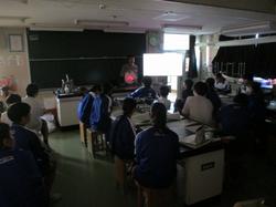 本日の授業の様子です。1年生の理科の授業では、暗幕で理科室内を暗室にして、光の性質についての学習を行っていました。光は、異なる物質の境界面を通過するとき、境界面で進行方向が変化する現象「屈折」が起こります。日常生活には縁のなさそうな現象ですが、光の屈折を利用しているのがレンズであり、そのおかげで私たちは眼鏡やカメラなどの便利な道具を使うことができています。いろいろな学習を通して、当たり前に身近に存在する科学に、より興味をもっていってほしいと思います。