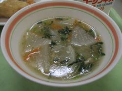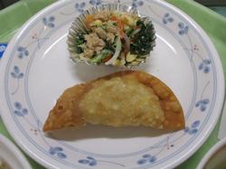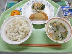 本日の給食です。本日も「旬を味わう献立」と題し、冬の始まりのこの時期に旬を迎える「白菜、れんこん、大根、みかん」を取り入れた献立が提供されました。「白菜とれんこんのしゃきしゃき揚げ餃子」は、餡の中に刻んだ白菜とれんこんが入っていることで、ジューシーかつしゃきしゃき食感な揚げ餃子となっており、ごはんのよく進む美味しさでした。「大根と鶏そぼろのほっこりしょうがスープ」は、とろみがついた熱々のスープで、大ぶりに切られた大根の中まで味が染みこんでおり、食感も良くとても美味しかったです。