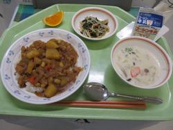 本日の給食です。「ハヤシライス」は、日本発祥の洋風料理で、一般的には牛肉や玉ねぎを炒め、デミグラスソースやトマトソースで煮込んだものをご飯にかけた料理です。本日は牛肉の代わりに豚肉を使い、玉ねぎに加えてジャガイモや大豆、ニンジンなどの野菜をたっぷり入れてデミグラスソースで煮込んだ、玉ねぎの甘さが際立つ栄養満点の一品でした。「クラムチャウダー」にたくさん入っているアサリは、低カロリーで高栄養、特に鉄分や亜鉛、ビタミンB12が豊富で、貧血予防や免疫力向上に役立ちます。他にも様々な栄養素をもち、成長期の中学生にもってこいの食材です。しっかり食べて、丈夫な体作りにつなげていってほしいと思います。