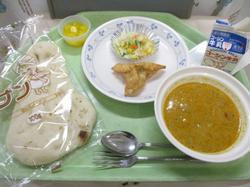 本日の給食です。本日は「世界のご当地グルメ旅 ~ インド ~ 」と題し、インド料理が提供されました。国土が広いインドでは、地方によって味付けや食材も様々ですが、スパイスを使った料理が多いです。主食は、北インドでは小麦粉を使ったナンなど、南インドでは米を食べることが多いそうです。「バターチキンカレー」は、トマトとバターのクリーミーなスープに、柔らかく煮込まれた鶏肉などの具材が一体となっており、食欲を刺激するスパイスの香り、まろやかな甘みと深いコクが口いっぱいに広がり、一口ごとに幸せを感じる贅沢な味わいでした。ナンとの相性も抜群で、本場の味に勝るとも劣らない、絶品のカレーでした。