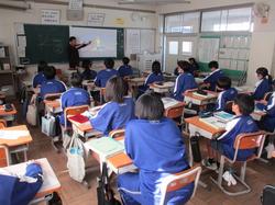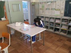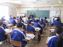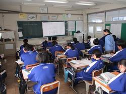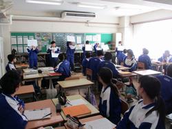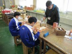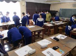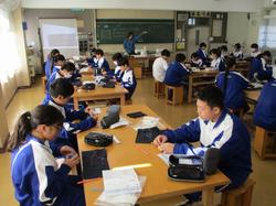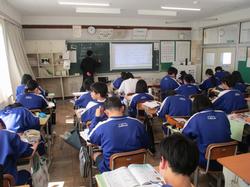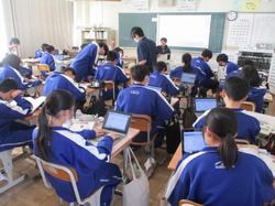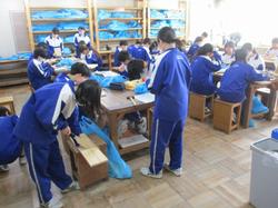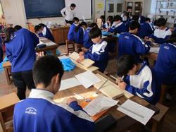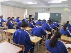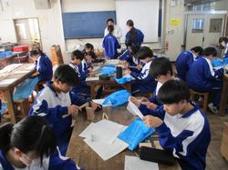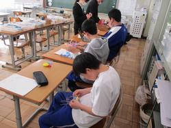 本日の授業の様子です。1年生の技術の授業では、作品の締め切りが迫ってきていることもあり、みんな黙々と作業に没頭していました。2年生の社会の授業では、これまで学習した内容について、班ごとに代表者がホワイトボードで回答する、クイズ番組のような問題演習を楽しそうに行っていました。3年生の社会の授業では、発問に対して積極的に挙手をして発言する生徒が多く、集中して授業に取り組んでいました。8組は作業学習で、かごやミサンガ、パズルボックスなどの作成を熱心に行っていました。