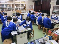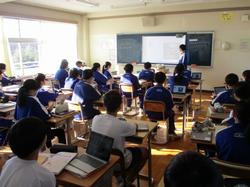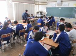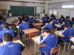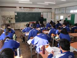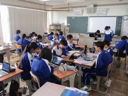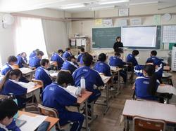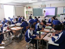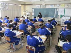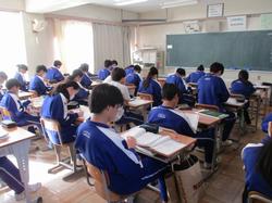 本日の授業の様子です。1年生の英語の授業では、絵をスクリーンに投影し、その絵の中で起こっている状況を英語で説明するという課題に取り組んでいました。発表者の生徒は前に立ち、現在進行形の表現を用いて一生懸命説明していました。将来より多くの方との交流を円滑に行うために、知識として英語を学習するだけでなく、実際にコミュニケーションをとるための言語としての英語の習得に向け、頑張っていってほしいと思います。