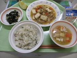 本日の給食です。1月は、2年生が家庭科の授業で立てた給食の中から9人分の献立が採用されており、本日はその第三弾です。献立を作成した生徒からは、「今までに出たことのある献立に少し材料を加え、栄養バランスが良くなるように工夫しました。美味しく食べてもらえると嬉しいです!」とのコメントが寄せられています。低カロリーながらカルシウムやカリウムなどのミネラルが豊富な食材であるわかめがたっぷりと使われた、栄養価の高さと美味しさが両立されたメニューでした。