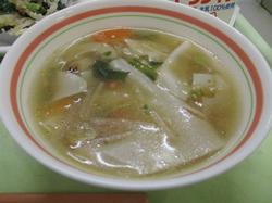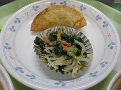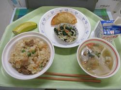 本日の給食です。2月は楽しみにしている生徒も多い、「リクエスト給食」です。本日のリクエストメニューは「キムタクチャーハン」、「手作り揚げ餃子」、「ワンタンスープ」です。「キムタクチャーハン」は、シャキッとしたたくあんの歯ごたえと、キムチのほどよい辛みがごはんに混ざり合い、甘じょっぱい旨味と爽やかな酸味が後を引く美味しさでした。