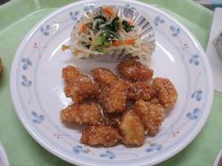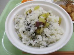 本日の給食です。2月は楽しみにしている生徒も多い、「リクエスト給食」です。本日のリクエストメニューは「さつまいもごはん」、「いかのかりんとうがらめ」です。特に「いかのかりんとうがらめ」は、衣をつけて揚げたイカを醤油ベースの甘辛ダレにからめたもので、濃い目の味付けでご飯がよく進む美味しさの大人気メニューです。