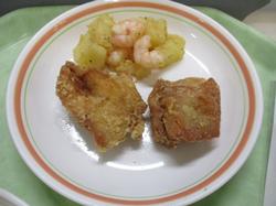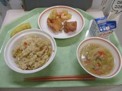 本日の給食です。2月は楽しみにしている生徒も多い、「リクエスト給食」です。本日のリクエストメニューは「鶏肉のからあげ」、「ガーリックシュリンプポテト」、「アルファベットスープ」です。「鶏肉のからあげ」は、言わずと知れた大人気メニューですが、衣はサクッとしていて、身はやわらかくてジューシーな仕上がりで、とても美味しかったです。「ガーリックシュリンプ」は、ニンニクの香りが強く感じられ、本格的な味わいでした。
