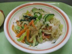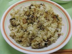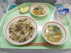 本日の給食です。給食で大人気の「いわしのひつまぶしご飯」は、香ばしく焼いたいわしを甘辛いタレでほぐし、ご飯にたっぷり混ぜ込んだ一品です。魚のうま味がごはん一粒一粒に広がり、しょうがを加えることで臭みもなく食べやすいのが特徴です。栄養と美味しさを両立した、栗中自慢のメニューです。