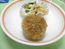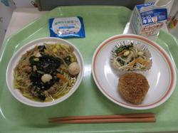 本日の給食です。「味噌ラーメン」は、にんにくやしょうがが香る赤みそのスープに、ひき肉やもやし、わかめ、コーン、うずらの卵などの具材がたくさん入っており、コクがあってとても美味しく、冷え込みの厳しい1日となった今日にふさわしい、身も心も温まる一杯でした。焼きおにぎりは、全体にかつお節やしょうゆの風味が染み込んでおり、出汁の風味をしっかり感じられるとても美味しいおにぎりでした。