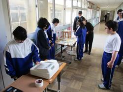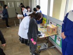 本日の授業の様子です。8組は、自立活動の一環で、バザーで残った商品を渡り廊下で職員に販売する学習を行っていました。自分たちが作った商品の良さを積極的にアピールし、購入してもらう喜びを実感している様子でした。