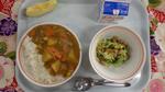 カレーピラフ 鮭とチーズの春巻き きゃべつと卵のスープ みかん 牛乳