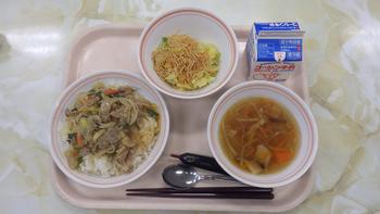 「6年生リクエスト給食」豚キムチ丼、ミルメークココア(2月25日)