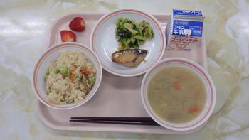 「6年生代表献立」五目ごはん、おこと汁、いちご(3月6日)