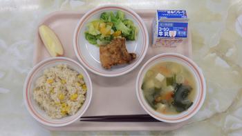 「6年生リクエスト給食」コーン茶飯、とりの唐揚げ、みかんサラダ(3月9日)