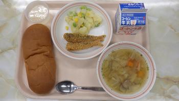 「地産地消献立」さつまいもパン、いわしのカリカリ揚げ、手作り梨ゼリー(4月23日)