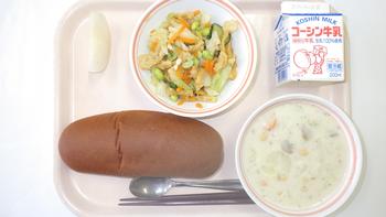 3日(水)黒糖パン クラムチャウダー こぎつねビーンズサラダ 梨 牛乳