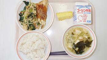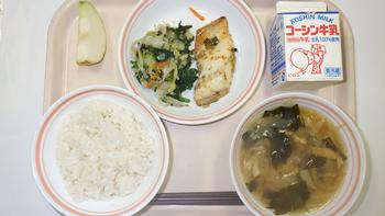4日(木)麦入りごはん(米粒麦) さばのピリカラ焼き のり和え 味噌汁(きゃべつ・若布・揚) りんご(青森県産「つがる」) 牛乳