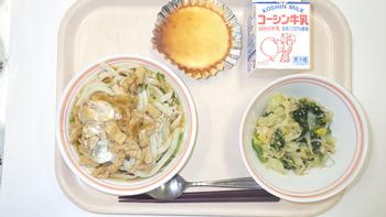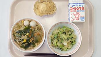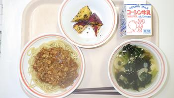5日(金)ジャージャーめん コーンわかめスープ 大学いも(千葉県香取市産) 牛乳
