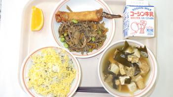 9日(火)菊花(きくか)ごはん ししゃものパリパリあげ 五目きんぴら(ごま・枝豆) 味噌汁(豆腐・若布・葱) ネーブルオレンジ 牛乳 ※重陽(ちょうよう)、菊の節句