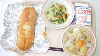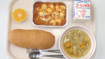 22日(月)胚芽パン 豆腐のミートグラタン きゃべつとじゃがいもの和風スープ きくかみかん 牛乳