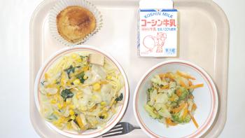 12日(金)冷やしきつねうどん ほうれんそうとコーンのごまあえ 米粉のマドレーヌ 牛乳