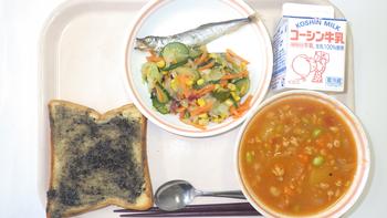 24日(水)セサミトースト 大豆のトマトシチュー かいそうサラダ 焼きししゃも 牛乳
