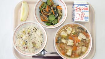 25日(木)さつまいもごはん 豆腐の中華煮(なると鶏) 切干大根の昆布茶サラダ りんご 牛乳