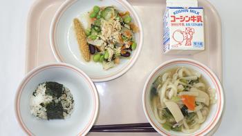 2日(木)京風うどん わかめおにぎり きびなごのカリカリフライ ビーンズサラダ(味噌ドレッシング) 牛乳